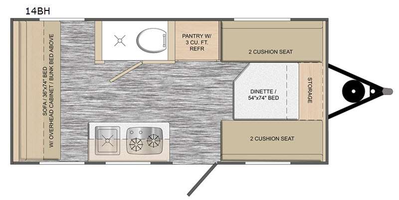 Sleeps 4 Length 15 ft 4 in Ext Width 8 ft Ext Height 7 ft 11 in Int Height 6 ft Dry Weight 1602 lbs Fresh Water Capacity 10 gals Grey Water Capacity 30 gals Black Water Capacity 5 gals Tire Size 13" Furnace BTU 20000 btu Number Of Bunks 1 Refrigerator Type Three Way Refrigerator Size 3 cu ft Cooktop Burners 2 Axle Weight 2000 lbs LP Tank Capacity 20 lbs Water Heater Type On Demand Tankless Axle Count 1 Number of LP Tanks 1 Shower Type Wet/Bath Shower Electrical Service 30 amp Similar Floorplans